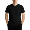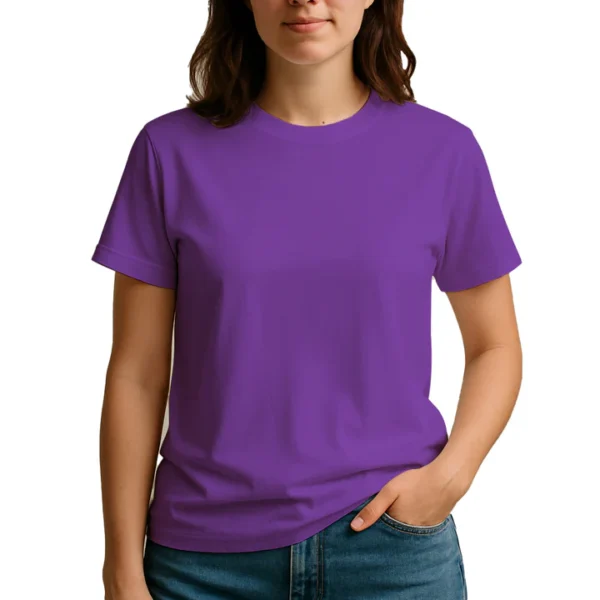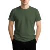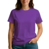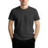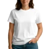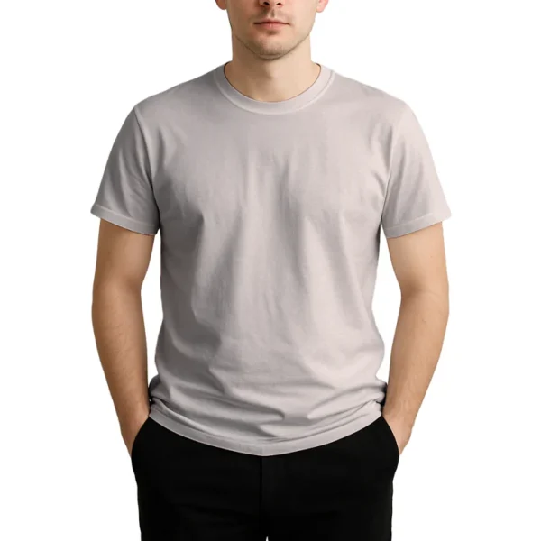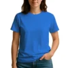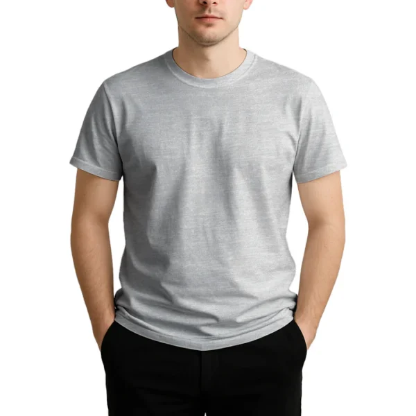 28 guage. 1×1 ribbed collar. Side seamed. 1.0” 2 needle sleeve and bottom hems. Tear-away booklet neck label. Self fabric shoulder to shoulder neck tape.